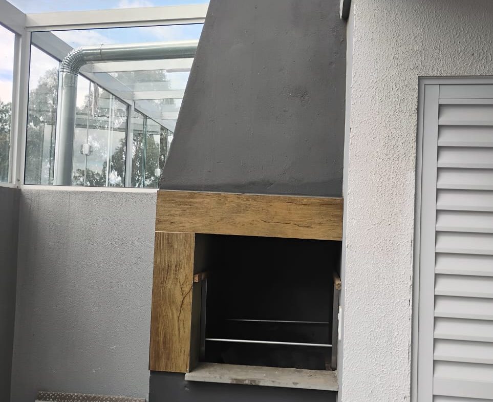 Parte inferior com área de serviço fechada de vidro, garagem e churrasqueira